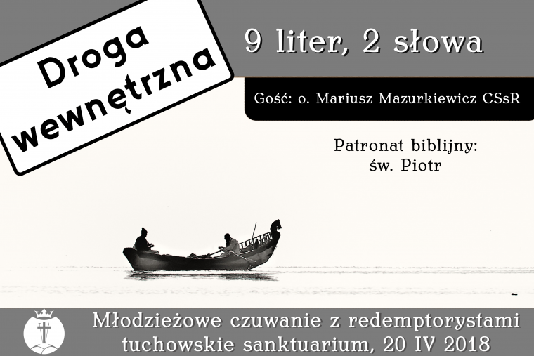 “9 liter, 2 słowa”. Tak brzmi hasło następnego czuwania z serii „Droga wewnętrzna”. Odbędzie się ono 20. kwietnia w sanktuarium Matki Bożej w Tuchowie. Patronem biblijnym będzie św. Piotr. Przybędzie ponadto gość. Jest nim odpowiedzialny w naszym Zgromadzeniu za Duszpasterstwo Młodzieży o. Mariusz Mazurkiewicz CSsR. Program czuwania: Eucharystia, konferencja, poczęstunek oraz adoracja Najświętszego Sakramentu. Zaczynamy o godz. 18.30. Zapraszamy!