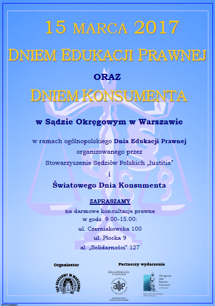 15 marca (w środę) od godziny 9.00 do 15.00 odbędą się darmowe konsultacje prawne w 3 punktach w Warszawie (woj.mazowieckim).Szczegółowe informacje na plakacie.Organizatorem ich jest Sąd Okręgowy w Warszawie.