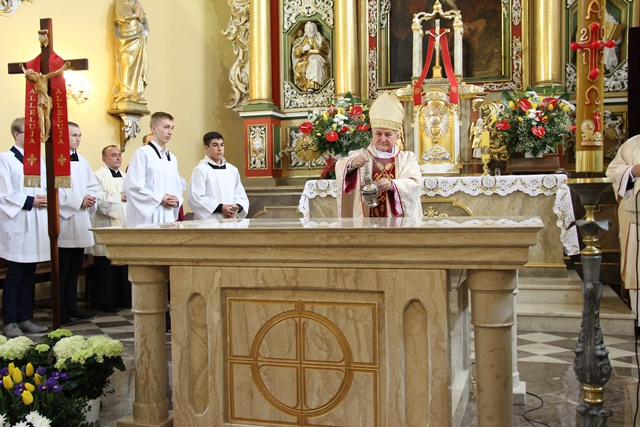 Podkreślał, że ołtarz jest najważniejszym miejscem w świątyni. – Na ołtarzu dokonuje się wielka tajemnica naszej wiary. Taki ołtarz ustawił pośrodku uczniów sam Jezus Chrystus w Wielki Czwartek w Wieczerniku. Dziś skłaniamy głowy przed poświęconym ołtarzem, który przeznaczony jest dla spraw świętych, bo przy każdej Mszy św. na ołtarz przychodzi Pan Jezus ukryty w Najświętszym Sakramencie – zaznaczył kaznodzieja.