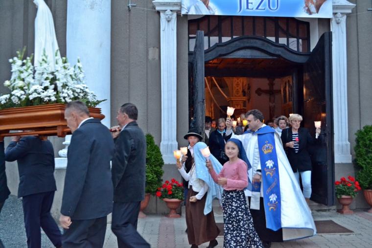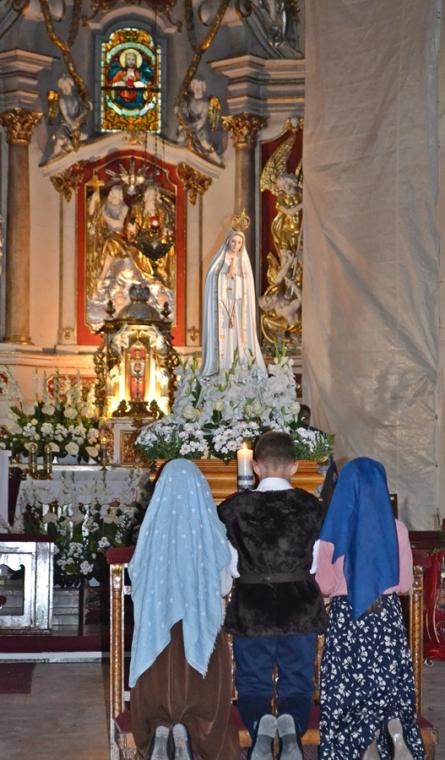 W rozważaniu poprzedzającym modlitwę różańcową ks. kan. Krzysztof przybliżył parafianom stan serc fatimskich pastuszków. Podkreślił, że byli  oni posłuszni swoim rodzicom, pełni prostoty i czystości. Jak wskazał, to zapewne było powodem tego, że to właśnie im Maryja powierzyła misje zaniesienia światu swego przesłania. W dalszej części rozważania ks. kanonik  przypomniał uczestnikom modlitewnego spotkania treść drugiego objawienia. Zaakcentował rolę i znaczenie ustanowienia nabożeństwa do Niepokalanego Serca Maryi. Podkreślając znaczenie wspólnoty i pracy nad sobą powiedział m.in. „ Nasza parafialna wspólnota ma również swoje serce. Ono bije  w każdym z nas. Wciąż uczymy się jaką powinniśmy być wspólnotą. Zadania te wynikają z naszego chrztu. Ponieważ jednak nasza ludzka natura skłonna jest do grzechu, dlatego wciąż modlimy się , pracujemy nad sobą, aby nasze serca były podobne do Serca Pana Jezusa i Niepokalanego Serca Maryi”.  Ks. kan. podkreślił, że w wielu miejscach, gdzie miały miejsce objawienia Matki Bożej gromadzą się tłumy wiernych, którzy chcą dotknąć tajemnicy Niepokalanego Serca Maryi.  Kończąc rozważanie ks. kan. powiedział:  „ My zgromadzeni na nabożeństwie fatimskim odmawiamy różaniec, śpiewamy pieśni maryjne, prosimy Maryję o wstawiennictwo u Trójjedynego Boga we wszystkich naszych potrzebach. Tym samym jesteśmy wspólnotą , której  celem jest sam Bóg”. Po zakończeniu rozważania rozpoczęliśmy modlitwę różańcową. Przy pięknie przyozdobionej figurze Pani Fatimskiej nie mogło zabraknąć pastuszków. W ich postacie wcieliły się dzieci z naszej parafii. Ku niebu popłynęła modlitwa, o którą nieustannie prosiła i prosi Maryja… W kontemplowaniu tajemnic różańca pomocne były rozważania ks. kanonika. Przed rozpoczęciem czwartej tajemnicy ks. kan. od świecy płonącej przy figurze odpalił świece pastuszków. Ci zanieśli to światło do uczestników nabożeństwa. Po zakończonej  modlitwie różańcowej wyruszyliśmy w procesji z figurą Fatimskiej Pani  zapalonymi świecami wokoło kościoła. Podczas procesji rozległo się bicie dzwonów w mikstackiej świątyni. Wzywają nas one i przypominają codziennie od dnia nawiedzenia o  Apelu Jasnogórskim. Gdy procesja powróciła do kościoła w duchowej łączności z Jasną Górą  śpiewaliśmy: Maryjo jestem, pamiętam, czuwam! Po końcowym błogosławieństwie wierni otoczyli figurę Fatimskiej Pani i zaśpiewali pieśń „ Zapada zmrok…”. Wypowiedziane  z życzliwością i uśmiechem słowa „ Dobrze, że jesteś”   do osób stojących najbliżej nas uświadomiły nam, że naprawdę jesteśmy wspólnotą. I jeszcze jedna refleksja. Pięknie prezentowała się udekorowana kwiatami Fatimska Pani, ale co najważniejsze otoczona była sercami kochających Ją ludzi.