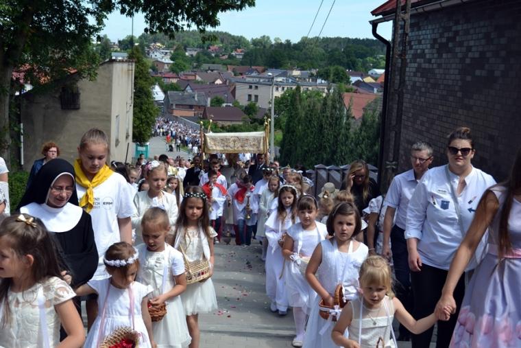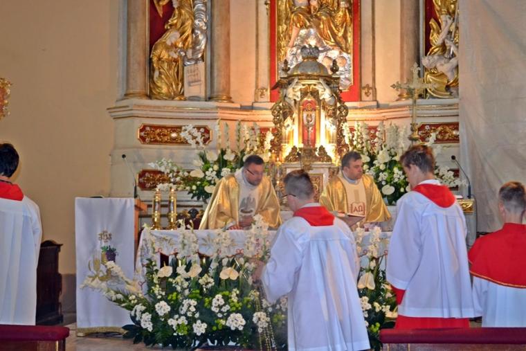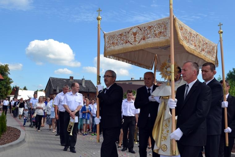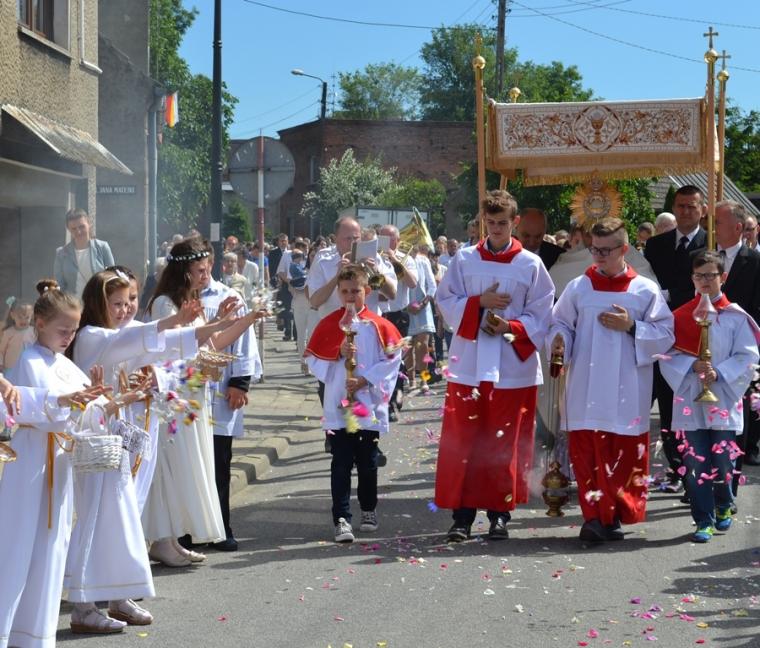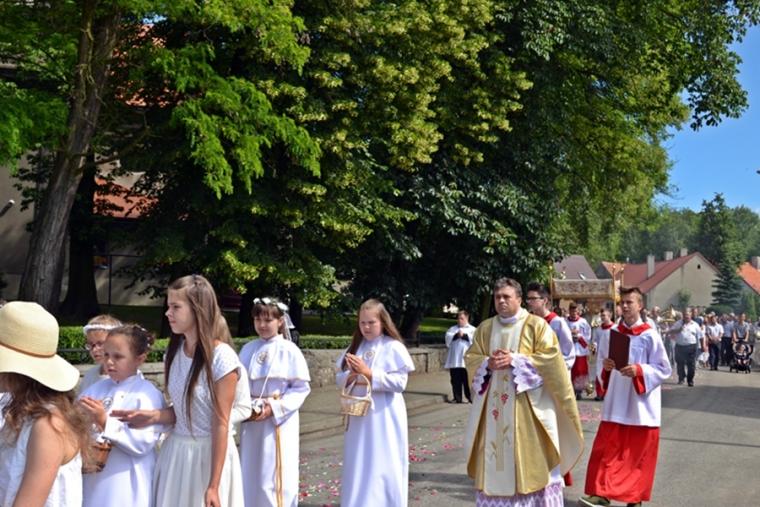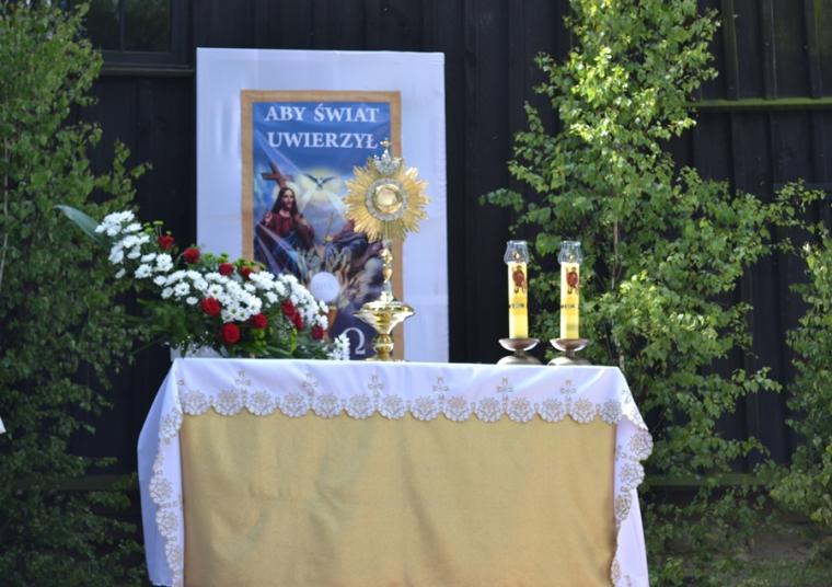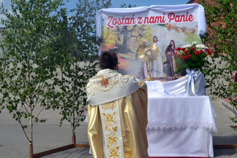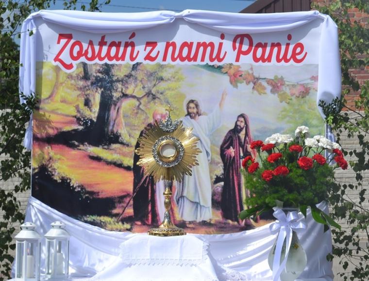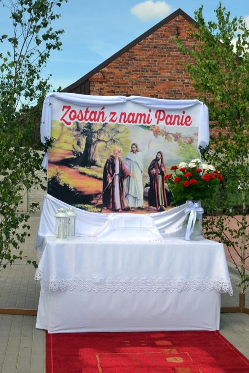 Po Mszy Świętej przed wystawionym Najświętszym Sakramentem, odmówiliśmy Litanię do Serca Jezusowego. Następnie wraz z Jezusem ukrytym pod postacią Chleba wyruszyliśmy w procesji do czterech ołtarzu. Krzyż, chorągwie, feretrony, poduszki z emblematami religijnymi niesione przez dzieci poprzedzały w procesji Jezusa ukrytego pod postacią Chleba niesionego w monstrancji. Tuż przed kapłanem niosącym monstrancje szły dziewczynki sypiące kwiatki. Pięknie przygotowane zostały ołtarze.