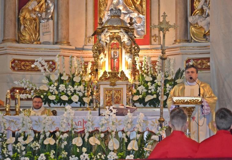 Kontynuując rozważanie ks. kan. podkreślił, że pierwszym celem liturgii jest uwielbienie Boga. Zwrócił także uwagę na zanik sacrum w życiu współczesnego człowieka, co prowadzi do tego, świat szybciej się sekularyzuje niż Kościół go ewangelizuje. Nawiązując do obchodzonego w tym roku 100- lecia objawień fatimskich ks. kan. Krzysztof powiedział: „…warto zatrzymać się nad treścią modlitwy anioła z Fatimy: „ O mój Boże, wierzę w Ciebie, uwielbiam Cię, kocham, Cię, ufam Tobie…”. W dalszej części kaznodzieja zwrócił uwagę na przywrócenie sacrum w dwóch wymiarach: doświadczenia wewnętrznego, ale także w wymiarze zewnętrznym czyli dotyczącym naszej postawy, gestów, staranności z jaką je wykonujemy. Kaznodzieja zachęcił zebranych do swoistego rachunku sumienia, do postawienia sobie osobiście pytania o to jak traktujemy Ciało Pańskie. Zapytał mi. in. o to czy przyklękamy przed tabernakulum, jak się zachowujemy, jaka przyjmujemy postawę mijając kapłana idącego z Najświętszym Sakramentem do chorych. Kontynuując pytał: Klęczysz czy kucasz? Gdzie w Piśmie Świętym jest napisane kucnij przed Panem”. Przywołał słowa św. Pawła mówiące „ Na imię Jezusa zegnie się każde kolano istot niebieskich i ziemskich i podziemnych”. Kaznodzieja zwrócił uwagę, że już podczas procesji eucharystycznej możemy zmienić swoją postawę i zgiąć kolana przed wychodzącym na nasze ulice Panem. Wiele ważnych słów padło w tej homilii. Trzeba mieć nadzieje, że pobudziły one uczestniczących w uroczystej sumie wiernych do refleksji, a w konsekwencji do podjęcia kroków mających na celu przywrócenia sacrum w naszym życiu.