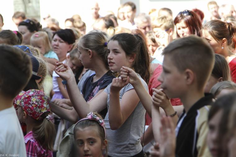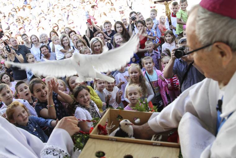Przed Mszą Świętą o godz. 15.00 pod przewodnictwem JE. ks. bpa Antoniego Długosza odbył się koncert zespołu „Pokolenia” oraz spotkanie z Magdą Buczek – założycielką Podwórkowych Kółek Różańcowych Dzieci. Tuż przed rozpoczęciem Eucharystii poprowadziła ona, wraz z siostrami służebniczkami dębickimi, koronkę do Miłosierdzia Bożego. Madzia podczas spotkania zachęcała zgromadzone licznie dzieci i wszystkich wiernych do odważnego apostołowania, świadczenia o Jezusie i Maryi oraz częstego odmawiania różańca, o co prosiła sama Matka Boża. Biskup Antoni Długosz podczas dialogowanego kazania, po przypomnieniu słów Ewangelii: „Pozwólcie dzieciom przychodzić do mnie” podkreślał to, jak ważni są rodzice dla dzieci i jak wielkim darem dla rodziców są dzieci. Rodzice tak nas kochają, że chcą, żebyśmy byli nie tylko ich dziećmi, ale też dziećmi Pana Boga. Matka Boża uczy nas miłości i miłosierdzia. Nigdy nie jest sama – jest zawsze z Panem Jezusem. Matka Boża jest zawsze z nami. Ks. biskup pomodlił się również wspólnie z dziećmi przez wstawiennictwo bł. Hiacynty i bł. Łucji z Fatimy. Zachęcił dzieci do rozmowy z Panem Jezusem i z Matką Bożą tak, jak rozmawiają z tatą i mamą. W nasze wakacje idziemy razem z Jezusem i Maryją! – tymi słowami oraz modlitwą do Pana Jezusa o to, by dał nam swoje oczy, ręce, serce bp Antoni zakończył kazanie. Po Mszy odbyło się błogosławieństwo Najświętszym Sakramentem wszystkich zgromadzonych, a po wypuszczeniu gołąbków pokoju miał miejsce koncert ks. bpa Antoniego Długosza.