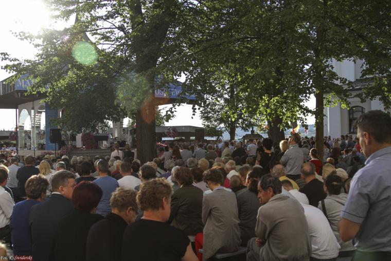 Ostatnia Msza Święta w tym dniu była sprawowana przy udziale przedstawicieli Stowarzyszenia Rodzin Katolickich, Domowego Kościoła, osób zaangażowanych w poradnictwo rodzinne, a także małżeństw przeżywających jubileusze. Eucharystii przewodniczył i słowo Boże wygłosił ks. prof. Marek Kluz z Tarnowa. Przypatrzcie się bracia powołaniu waszemu. Mówił, że jednym z apeli z Fatimy było wezwanie do uświęcania rodzin. Maryja mówi nam, abyśmy nie wyrzucali Boga z domu. Im bardziej pustoszeją świątynie, tym bardziej niszczą się rodziny. Wszystkim z nas potrzebna jest miłość, a jej źródłem jest obecność Boga w rodzinie. Matka Teresa mówiła, że życzy każdej rodzinie tylko jednej rzeczy, aby nauczyła się razem modlić. Taka rodzina nigdy się nie rozpadnie. Największą ewangelizacją dla każdego jest widok modlących się mamy i taty. Atmosfera każdego domu zależy od tego czy i jak się w nim rozmawia. Kiedy ostatnim razem powiedziałeś swojemu dziecku, żonie, mężowi, że ich kochasz? Najwięcej miłości ma w sobie prawdziwe przebaczenie. Nie zrażajmy się trudnościami, wykonujmy wszystko z nadzieją i radością, oczekując nagrody od Ojca. Pamiętajmy, że zawsze możemy zwrócić się o pomoc do tej, która jest Matką pięknej miłości.