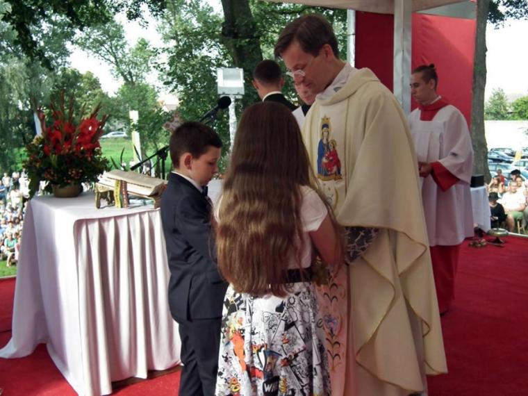 Gwarno zrobiło się wokół sanktuarium około godz. 16:00. Na tę godzinę do Matki Bożej Pocieszenia zostały w sposób szczególny zaproszone rodziny z dziećmi. „Pozwólcie dzieciom przychodzić do Mnie, nie przeszkadzajcie im…” powiedział Pan Jezus do apostołów. Nie zabraniali, nie przeszkadzali w przyjściu do Jezusa licznie zebranym u Lutogniewskiej Pani dzieciom rodzice. Przyszli z nimi, przyprowadzili je, przynieśli na rękach, przywieźli w wózkach, by mogły otrzymać indywidualne błogosławieństwo. Mszy św. w intencji rodzin przewodniczył ks. dr Jarosław Powąska. Potem wszystkim dzieciom i tym maleńkim i tym większym kapłani udzielili indywidualnego błogosławieństwa. Nie zabrakło niespodzianki dla najmłodszych czcicieli Matki Bożej Pocieszenia. Radowało się serce kustosza sanktuarium tak licznym udziałem rodzin w uroczystościach odpustowych. Rodzice i dziadkowi, którzy przybyli do Lutogniewskiej Matki z najmłodszymi dali piękne świadectwo wiary i zaufania Matce i Jego Synowi.” Słowa uczą, ale przykład pociąga…”. Można więc mieć nadzieję, że rośnie kolejne pokolenie czcicieli Matki Boże Pocieszenia z Lutogniewa.