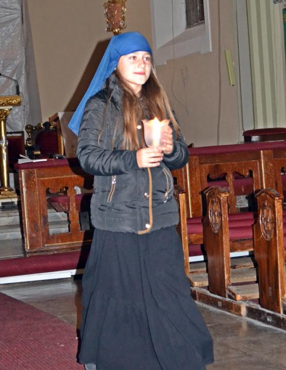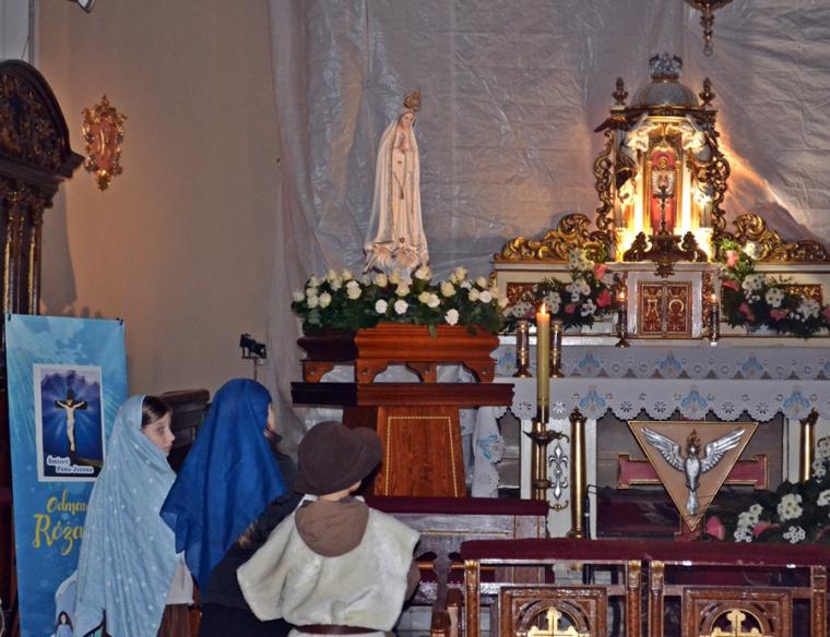 W atmosferę ostatniego objawienia fatimskiego wprowadził nas film „Cud słońca”. Przy pięknie ozdobionej figurze Matki Bożej Fatimskiej ustawionej tym razem nieopodal ołtarza pojawili się także trzej pastuszkowie. W postacie te wcieliło się troje dzieci z naszej parafii, które po zakończeniu trzeciej tajemnicy różańca rozniosły zebranym w kościele światło odpalane od świecy jubileuszowej.