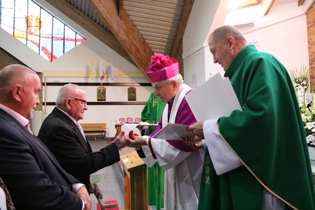 Biskup kaliski Edward Janiak wręczył Srebrne Pierścienie św. Józefa parafianom Ostrowskiego Sanktuarium Miłosierdzia Bożego, którzy od początku istnienia parafii angażują się w jej rozwój.