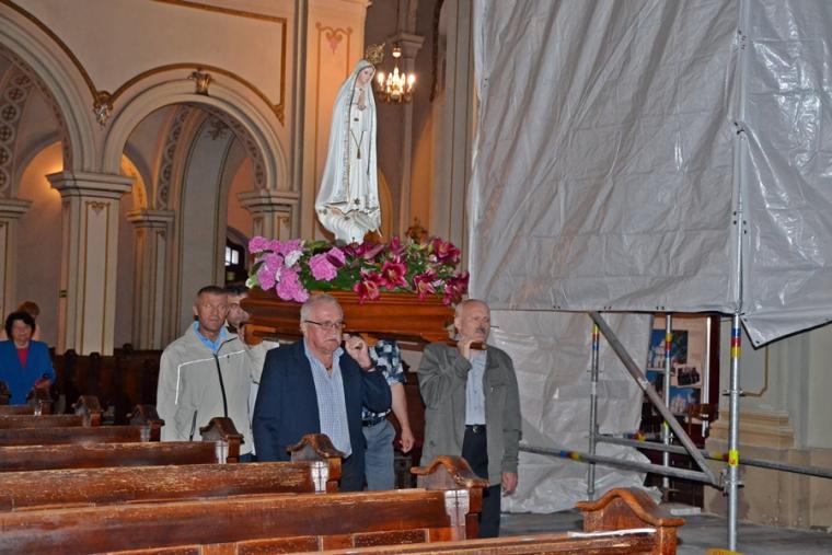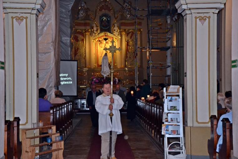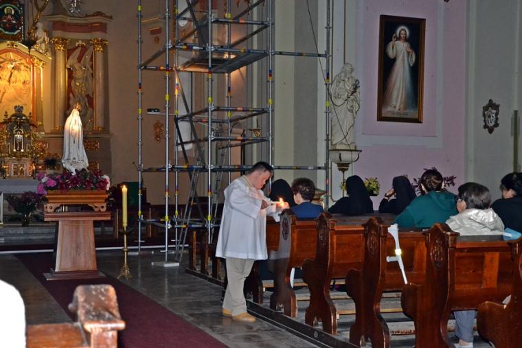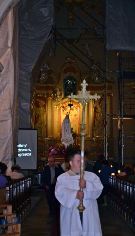13. lipca o godz. 20:00 mikstaccy parafianie zgromadzili się na trzecim już w tym roku nabożeństwie fatimskim. Gdy przed rokiem relacjonowaliśmy to nabożeństwo ołtarz główny przesłonięty był foliową zasłoną. Trwały prace renowacyjne przy płaskorzeźbie Trójcy Świętej. Dziś możemy już podziwiać jej piękno. Lipcowe nabożeństwo fatimskie AD 2019 ponownie odprawione zostało w scenerii rusztowań i foliowych zasłon, kontynuowane są prace renowacyjne. Jednak i w tej „renowacyjnej scenerii” pięknie prezentowała się figura Matki Bożej Fatimskiej ustawiona w nawie środkowej, przyozdobiona kwiatami i otoczona miłującymi ją sercami parafian. Lipcowemu nabożeństwu fatimskiemu przewodniczył ks. proboszcz Krzysztof Ordziniak. Przed rozpoczęciem modlitwy różańcowej wprowadził nas w atmosferę wydarzenia sprzed ponad wieku. . Zapoznał nas z orędziem Maryi przekazanym dzieciom, podkreślając jednocześnie, że zadziwiać mogą te same okoliczności objawienia, wygląd szat Matki Bożej. Zaakcentował, że w czasach współczesnych do człowieka dociera wiele różnorodnych bodźców. Ks. kanonik zwrócił uwagę, że objawienia Maryi wskazują na potęgę tkwiąc nie w wielości, ale w systematyczności. Kapłan zachęcał zebranych do refleksji nad tym jaką modlitwę możemy systematycznie praktykować. Zachęcał do łącznia systematycznej modlitwy z udziałem w Eucharystii podczas której, możemy przyjmować Ciało Chrystusa. Zaakcentował, że świętość można osiągnąć realizując na co dzień wolę Bożą względem nas.