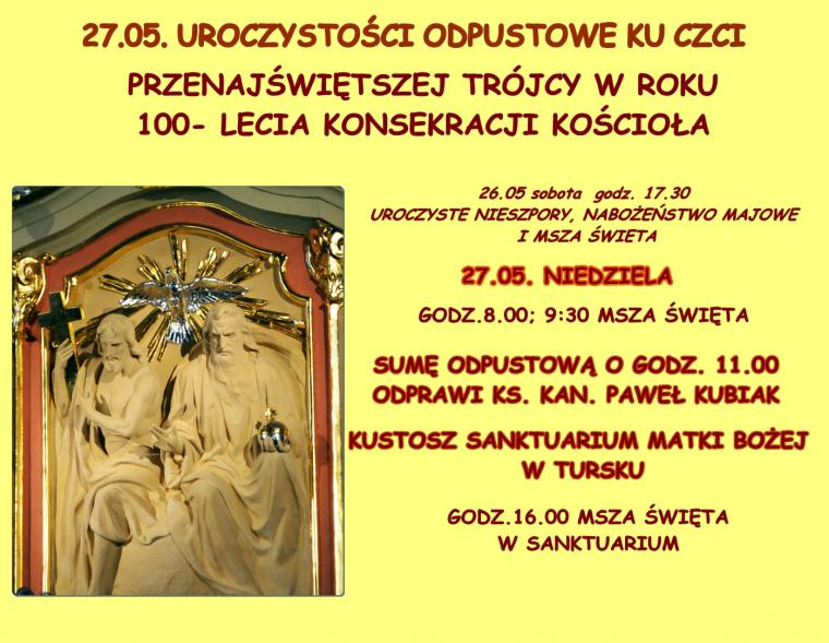 Uroczystości odpustowe rozpoczniemy już w sobotni wieczór 26. maja  o godz. 17.30 uroczystymi nieszporami, nabożeństwem majowym i Eucharystią.