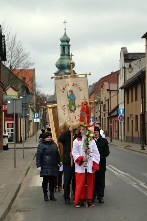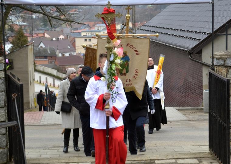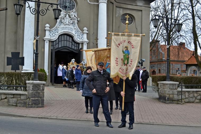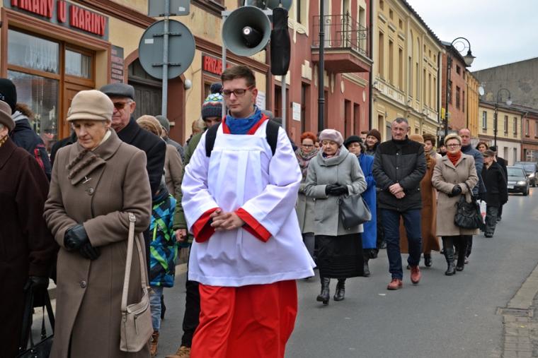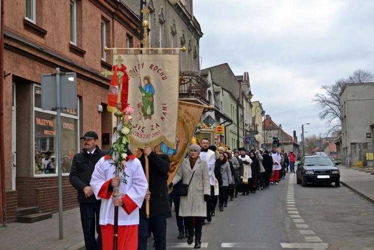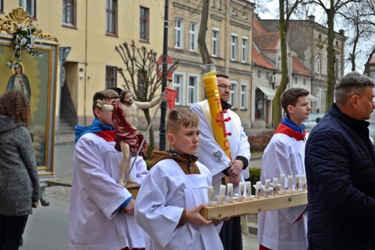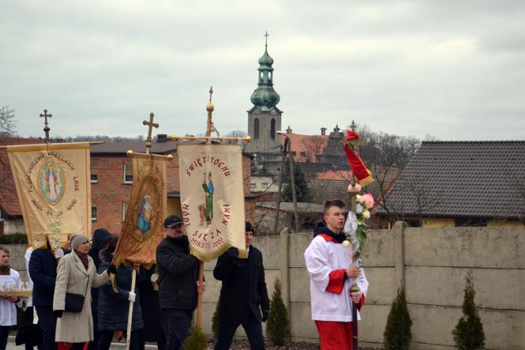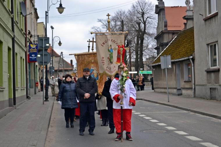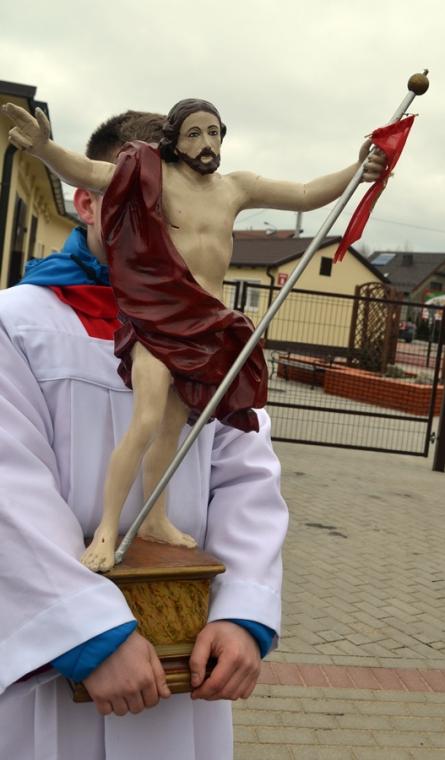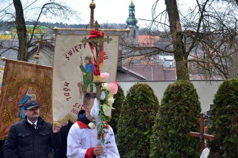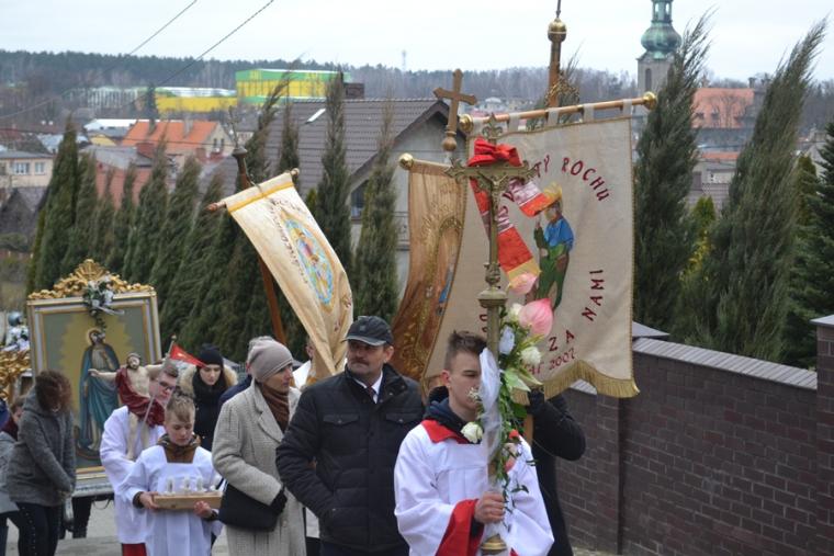 Po odprawieniu Nowenny do Miłosierdzia Bożego  z krzyżem, paschałem, figurą Chrystusa zmartwychwstałego, feretronami i sztandarami,  wyszliśmy na ulice naszego miasteczka. W naszą drogę do Emaus wyruszyliśmy z naszymi duszpasterzami: ks. kan. Krzysztofem Ordzinikiem, ks. Krzysztofem Lipińskim i ks. Mateuszem  Puchałą. Ks. Krzysztof Lipiński niósł zapalony paschał, natomiast ks. kan. Krzysztof wraz z ks. Mateuszem prowadzili nabożeństwo Drogi Światła. Pierwsze spotkanie ze zmartwychwstałym Panem rozważaliśmy przed kościołem pw. Świętej Trójcy. Warto dodać, że wspólnota parafialna przygotowuje się do obchodów 100-lecia jego konsekracji. Ostatnie, przy Diecezjalnym Sanktuarium Świętego Rocha. Sanktuarium położone jest w centralnym punkcie cmentarza. Tu wielu uczestników procesji ma groby swoich bliskich. Dla nich przesłanie “Pan zmartwychwstał” nabiera tu szczególnego znaczenia. Daje nadzieję na spotkanie z tymi, którzy poprzedzili nas w  pielgrzymce do Ojczyzny niebieskiej.