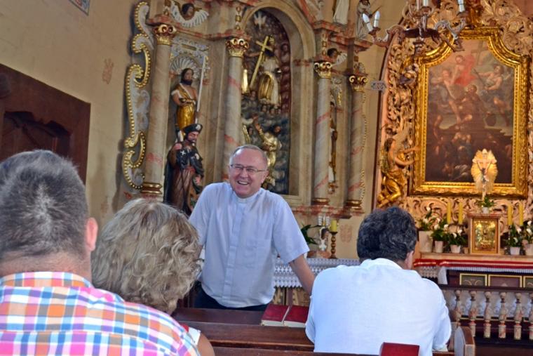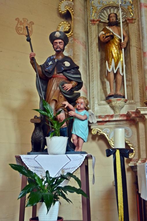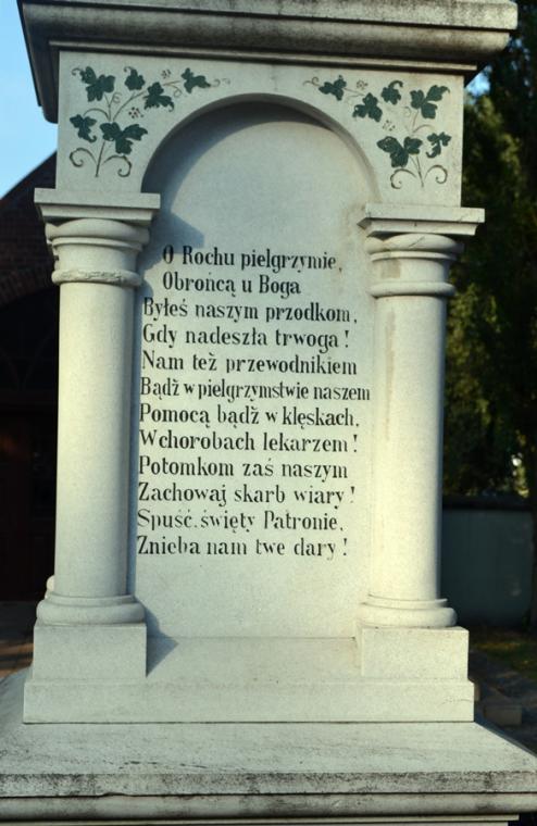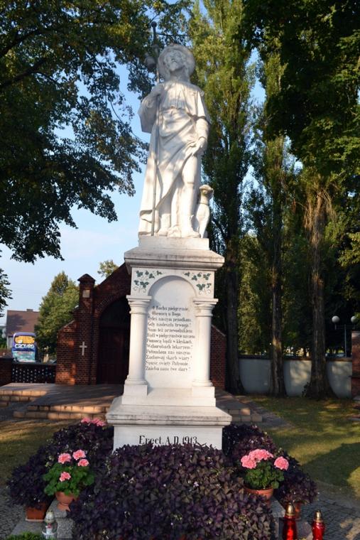 Pierwszym miejscem, które nawiedziliśmy w upalny sobotni dzień był położony na wzgórzu kościół pw. Świętego Rocha w Dobrzeniu Wielkim. To miejsce dla nas szczególne. Podobnie jak w Mikstacie znajduje się tu zabytkowy drewniany kościół pw. Świętego Rocha. W Dobrzeniu, podobnie jak w naszej parafii wierni czczą św. Rocha.  Przy kościele oczekiwał na nas ks. proboszcz Jan Polok. Ks. Jan jest także wielkim czcicielem św. Rocha i autorem książki dla dzieci pt. Święty Roch pielgrzym miłości. W kościele był czas na chwilę modlitwy, a następnie ks. Jan przekazał nam kilka ciekawostek związanych z budową tej pięknej świątyni. Opowiedział nam o wystroju kościoła zwracając szczególną uwagę na obraz w ołtarzu głównym przedstawiający św. Rocha orędującego u Boga za chorymi. Z zainteresowaniem wysłuchaliśmy informacji o przebiegu uroczystości odpustowych w Dobrzeniu. Zachwycił wielu ten niewielki, ale niezwykle urokliwy kościół. Po wysłuchaniu informacji ks. Jana odmówiliśmy Litanie do Świętego Rocha. Przed świątynią znajduje się figura św. Rocha w stroju pielgrzyma. Pielgrzym to ktoś znajdujący się w drodze. My także pielgrzymowaliśmy. Było nam dobrze u św. Rocha w  Dobrzeniu. Niestety, trzeba było wyruszać  dalszą drogę.
