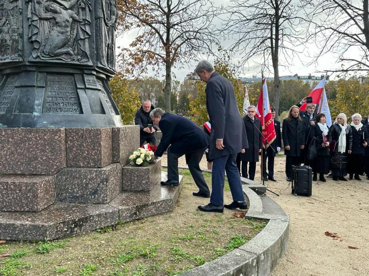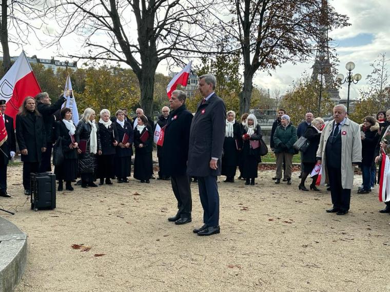 Po Mszy św. Polacy udali się pod paryski pomnik Adama Mickiewicza, aby tam złożyć kwiaty. W trakcie przemówienia ambasador RP we Francji Jan Emeryk Rościszewski przypomniał, że współcześnie niepodległość Polski nabrała szczególnego znaczenia wobec niepewnej sytuacji politycznej na świecie. „Polska musi dbać o swoją niepodległość. Polska dzisiaj jest najsilniejszym obok Francji krajem jeśli chodzi o armię lądową (…). Jeśli o niepodległości sami nie będziemy myśleć, nie będziemy o nią dbać, to nikt inny za nas tego nie zrobi. Oczywiście cieszymy się z tego, że jesteśmy w silnym Sojuszu Północnoatlantyckim, że jesteśmy w Unii Europejskiej. To te związki, które pozwalają nam czuć się pewniej. Niech ten dzień będzie radosny. Myślmy o naszym kraju, o Polsce. Niech żyje Polska!” – powiedział ambasador RP.