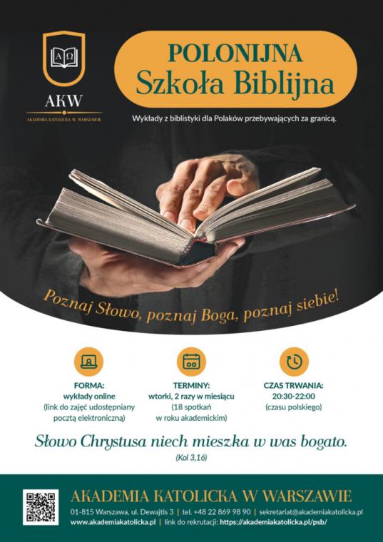 Akademia Katolicka w Warszawie uruchamia wyjątkowy projekt skierowany do Polonii – Polonijną Szkołę Biblijną, która odpowiada na rosnącą potrzebę pogłębionej formacji religijnej wśród Polaków mieszkających poza granicami kraju. Przystępne wykłady, prowadzone z pasją, w uporządkowany sposób wprowadzą nas w świat ksiąg Starego i Nowego Testamentu, wyjaśniając ich powstanie, kontekst historyczno‑kulturowy oraz teologię. Będziemy odkrywać, jak Bóg mówi dziś do nas w swoim Słowie i jak przekłada się to na codzienne życie wiary.