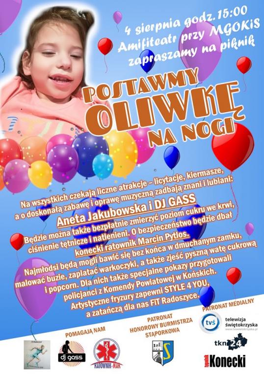 Już dzisiaj (4 sierpnia) od godz.15.00 w Amfiteatrze w Stąporkowie (woj.świętokrzyskim) odbędzie się piknik charytatywny.Ma on na celu pomóc 3-letniej Oliwce,która zmaga się z dziecięcym porażeniem mózgowym.