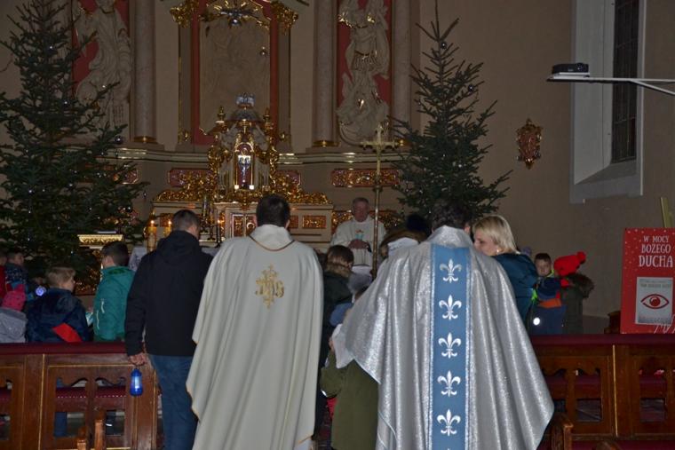 Po zakończeniu mszy świętej, przy banerze przedstawiającym Grotę Narodzenia Pana Jezusa ks. proboszcz zapalał świece, lampki przyniesione przez wiernych. Wiele osób zabrało do swoich domów Betlejemskie Światło Pokoju. Stojące przy ołtarzu w kościele i zaniesione do naszych domów Betlejemskie Światło Pokoju przypomina nam, że Pan jest już blisko, naprawdę blisko. Mobilizuje nas ono do czuwania i oczekiwania wraz z Maryją Józefem na przyjście Pana.