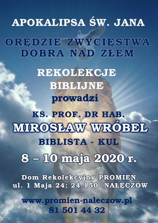 Rekolekcje noszące tytuł: Apokalipsa św. Jana - orędzie zwycięstwa dobra nad złem będzie prowadził Ks. prof. dr hab. Mirosław Wróbel. Rekolekcje te będą okazją do odczytania losów naszego pokolenia i spojrzenia w przyszłość w świetle Słowa Bożego. W każdym z nas jest oczekiwanie na spełnienie obietnic Boga i tęsknota za pokojem, zwycięstwem dobra nad złem. Czy Apokalipsa zapowiada taki czas? Odpowiedz na to pytanie otrzyma każdy, kto w ciszy Domu Rekolekcyjnego PROMIEŃ, prowadzonego przez Zgromadzenie Sióstr Służek NMP Niepokalanej w Nałęczowie, zatrzyma się i zechce wziąć udział w tych rekolekcjach.