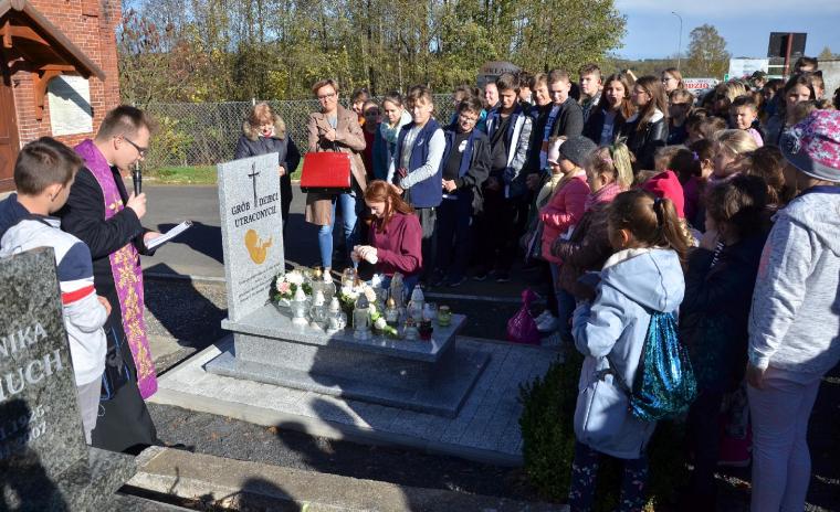 Wyprawa na cmentarz to inicjatywa dyrektor Aliny Męczywór, która o przewodniczenie modlitwie poprosiła ks. Jakuba Sikorskiego, wikariusza parafii pw. św. Józefa Oblubieńca NMP w Olszynie i zarazem katechetę w olszyńskiej „Trójce”.