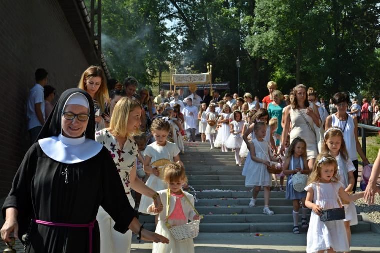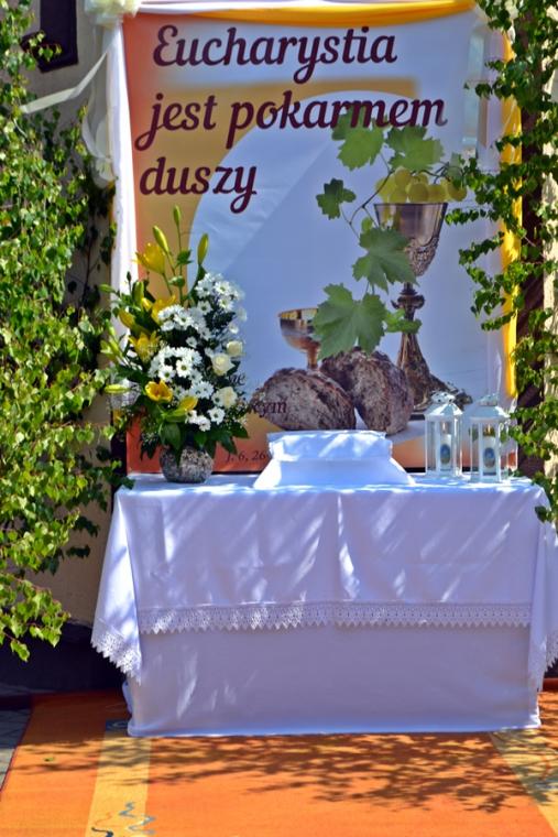 Wracając do głównego wątku rozważania kaznodzieja zachęcał wiernych do postawienia sobie pytania: „Co Jezus ukryty pod postacią Chleba, zobaczy w czasie wędrowania przez nasze miasto i parafię? Jaką zobaczy Ojczyznę, jaki Kościół, jaką rodzinę, jakiego człowieka?”. W dalszej części homilii celebrans podkreślił, że uroczystość Bożego Ciała jest wielkim pokłonem złożonym Jezusowi, ale jednocześnie zachęcał, by odpowiedzieć sobie na pytanie, czy zawsze oddajemy Bogu pokłon. Zaznaczył, że różnie z tym bywa. Myślą przewodnią rozważania były słowa pieśni „ Zróbcie Mu miejsce…”. Kończąc rozważanie ks. kanonik powiedział: „ Mam do Was ogromną prośbę w tym roku, abyśmy zrobili Bogu miejsce w naszych kalendarzach, które są tak mocno zapełnione różnymi sprawami”. Parafia podzielona jest na rejony, jak podkreślił ks. proboszcz nie tylko po to, by wywiązywały się one m.in. z organizacji procesji w poszczególnych dniach, ale i po to, by ich mieszkańcy w tych dniach uczestniczyli w Eucharystii. Jak odpowiemy na to zaproszenie? Czy zrobimy miejsce dla Pana w naszych sercach i w naszych kalendarzach. Tak wielu z nas przyjęło Jezusa w Komunii Świętej. Zrobiliśmy Mu miejsce w naszych sercach. Po Mszy Świętej odbyło się wystawienie Najświętszego Sakramentu, następnie wraz z Jezusem ukrytym pod postacią Chleba wyruszyliśmy w procesji do czterech ołtarzy. Przedstawiciele poszczególnych regionów przygotowali ołtarze. Trasa tegorocznej procesji wiodła od Diecezjalnego Sanktuarium Świętego Rocha do krzyża misyjnego przy naszej farze, której 100- lecie konsekracji przeżywać będziemy w październiku. Jak to już staje się tradycją w naszej wspólnocie co roku procesja odbywa się inna trasą, bo Jezus przychodzi do wszystkich. Przy poszczególnych ołtarzach wsłuchiwaliśmy się w rozważania, których myślą przewodnia była EUCHARYSTIA. Na pierwszym ołtarzu znajdowało się hasło: Eucharystia jest Ofiarą. W słowach rozważania usłyszeliśmy m.in. „ W opisie Eucharystii bardzo ważne są cztery czasowniki: brać, błogosławić, łamać, dawać. Dzięki nim możemy zaobserwować, na czym polega logika ofiary Jezusa”. O tym jak wielka jest tajemnica Boga i o Eucharystii jako pokarmie dla duszy mowa była w rozważaniu przy drugim ołtarzu. Na trzecim ołtarzu widniało hasło: „Eucharystia jest sakramentem zjednoczenia”. Tu do wiernych popłynęło przesłanie: „ Ten, który pokonał śmierć może wejść pomimo drzwi zamkniętych, pomimo zakrytych bielmem oczu i zatwardziałych serc. Wówczas, gdy On wychodzi nam naprzeciw , ukazuje się jako żyjący, dający życie”. Hasło na trzecim ołtarzu zachęcało nas do spojrzenia na Eucharystię jako zadatek nieśmiertelności. Tu wybrzmiało także Te Deum laudamus. Procesję zakończyło błogosławieństwo Najświętszym Sakramentem na cztery strony świata. Podczas procesji niesione były sztandary i feretrony. Uroczystość uświetniła orkiestr parafialna i chór. A tuż przed baldachimem kroczyły dziewczęta sypiące kwiatki. Było ich podczas tegorocznej procesji bardzo dużo. Jezus ukryty pod postacią Chleba przemierzał ulice naszego miasteczka obsypywany płatkami kwiatków.