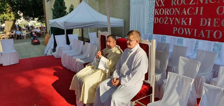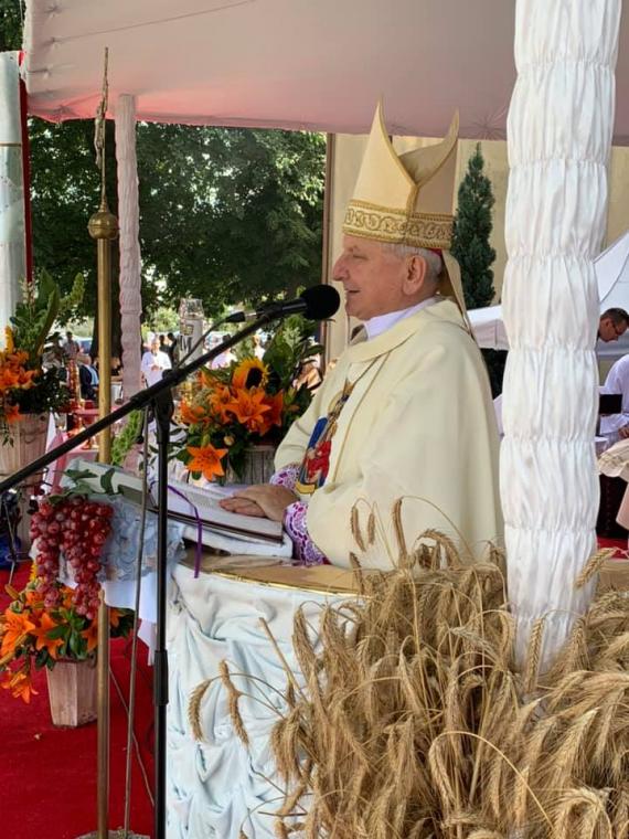 który przewodniczył Pontyfikalnej Sumie Odpustowej i dziękczynnej za tegoroczne plony podczas dożynek diecezjalno ~ powiatowych w Lutogniewie. Uroczystość połączono z dziękczynieniem za XX Rocznicę Koronacji Obrazu Matki Bożej Pocieszenia. Do Sanktuarium Matki Bożej Pocieszenia od wczesnego rana przybywali pielgrzymi w pieszych i autokarowych pielgrzymkach wraz ze swoimi duszpasterzami z terenu całej diecezji kaliskiej. Przed Eucharystią biskup kaliski Edward Janiak obejrzał wieńce dożynkowe przywiezione przez delegacje rolników z trzydziestu trzech dekanatów diecezji kaliskiej. Biskup podziwiał trud pracy, który rolnicy włożyli w przygotowanie wieńców. Mszy świętej dziękczynnej przewodniczył pierwszy biskup kaliski Stanisław Napierała. Wraz z Nim modlili się biskup kaliski Edward Janiak, ks. kan. Łukasz Żurawski, kustosz Sanktuarium Matki Bożej Pocieszenia w Lutogniewie. W swoim słowie biskup kaliski wspominał, że 20 lat temu jako biskup pomocniczy archidiecezji wrocławskiej uczestniczył w uroczystości koronacji obrazu Matki Bożej Pocieszenia. „Księże Biskupie Stanisławie to Twoim staraniem te korony otrzymała wtedy Matka Boża.” ~ powiedział biskup kaliski Edward Janiak.