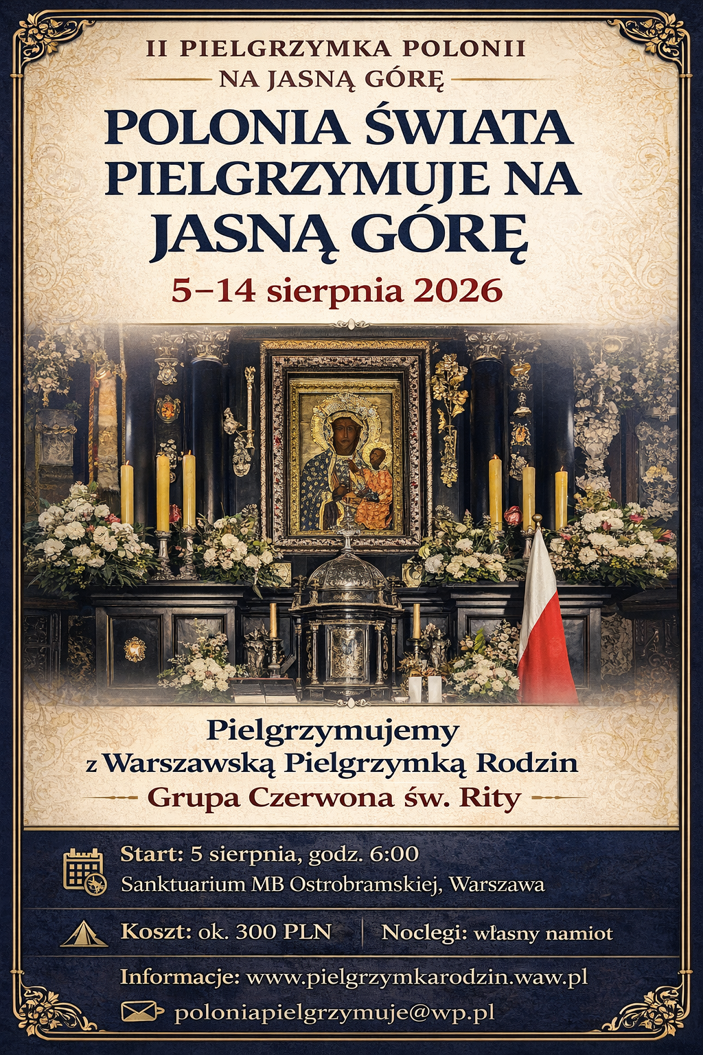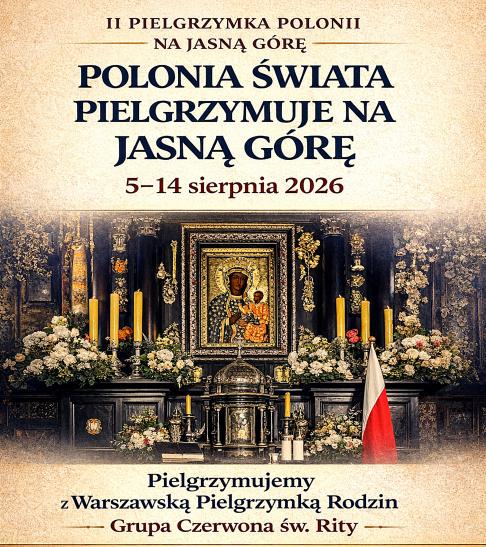 Serdecznie zapraszamy Polonię do udziału w Pielgrzymce Polonii Świata na Jasną Górę, która odbędzie się w dniach 5–14 sierpnia 2026 roku. Będzie to wyjątkowy czas wspólnej modlitwy, duchowej refleksji oraz budowania wspólnoty Polaków rozsianych po całym świecie. Pielgrzymkę rozpoczniemy 5 sierpnia 2026 r. rano uroczystą Eucharystią o godz. 6:00 w Sanktuarium Matki Bożej Ostrobramskiej przy parafii Narodzenia Pańskiego w Warszawie, skąd wyruszymy na pielgrzymkowy szlak w kierunku Jasnej Góry.
